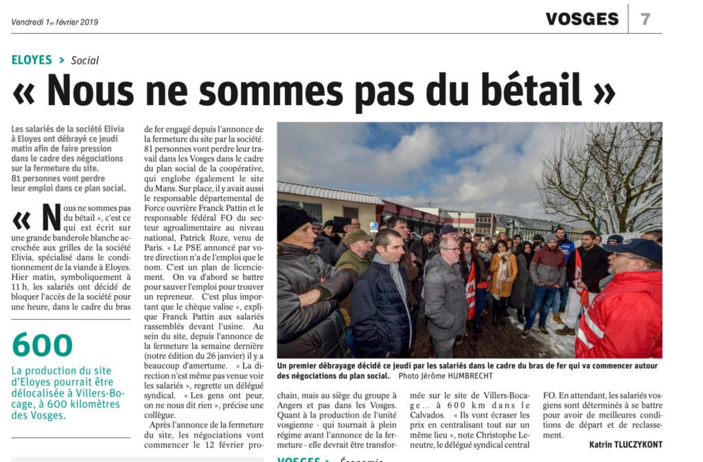 Ce débrayage d’une heure a été l’occasion pour les salariés de lever des interrogations sur la procédure du PSE à venir en posant directement des questions aux interlocuteurs de la FGTA-FO et de l’UD des Vosges… FO a insisté sur le fait que si une priorité serait de trouver un repreneur (ce qui n’est pas à exclure) il fallait maintenant se battre sur la partie sociale de ce Plan en mettant tout en œuvre pour repositionner le maximum de salariés, soit dans le groupe Elivia soit en externe, et faire évoluer positivement lors des négociations à venir le montant des indemnités de licenciement.