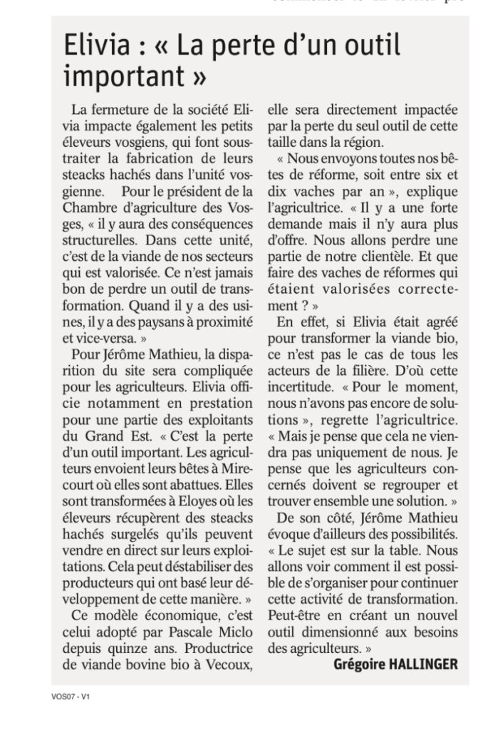 L’outil industriel vosgien a été sacrifié par Elivia à la suite des résultats financiers négatifs sur un marché de la viande bousculé notamment entre une consommation en baisse, la pression de la grande distribution et des prix qui stagnent… La production sera transférée sur le site Elivia de Villers-Bocage dans le Calvados avec comme objectif d’écraser des frais fixes et de faire des économies d’échelle…